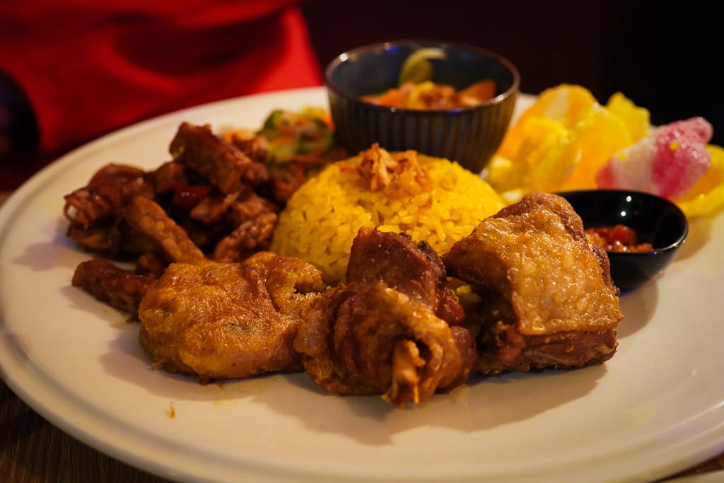 This vibrant turmeric and coconut-infused rice is served with crispy, well-seasoned fried chicken, a side of sayur lodeh (a coconut-based vegetable stew), sweet and sour pickled cucumber, and house-made sambal—a spicy chili paste that really packs a punch!