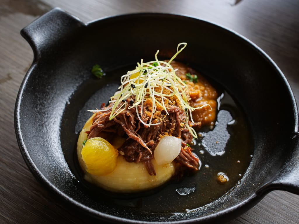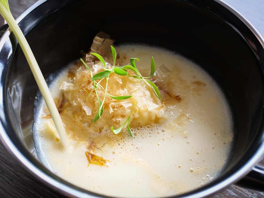 Chef Lin serves his classics under his handle Mama Q, named after his mom. First up was a beautiful Thai-style dry tom kha kai, served with cassava and Koppert Cress micro-herbs.